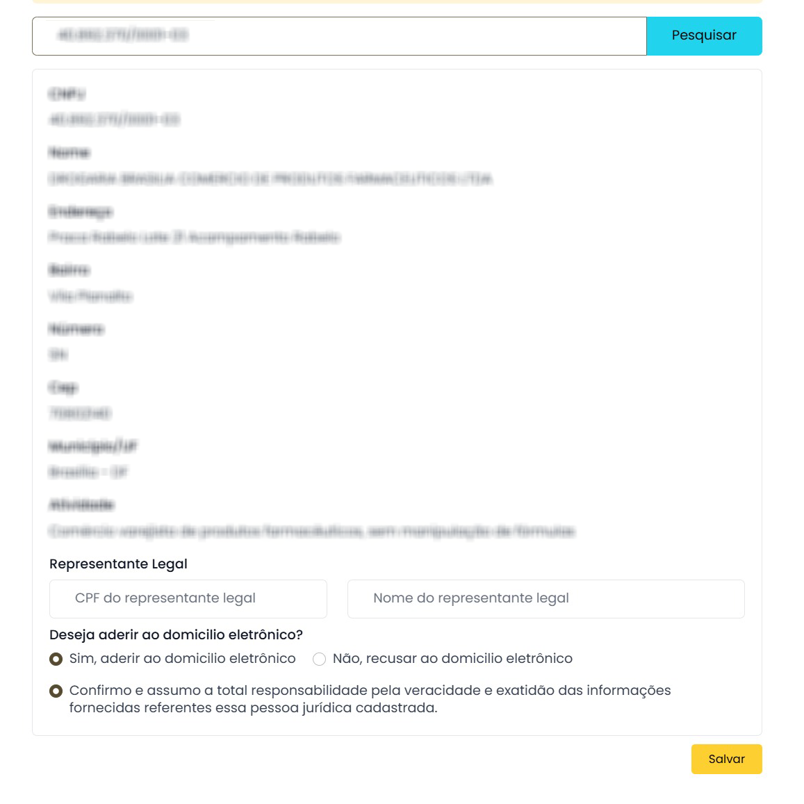 8. Preencha seus dados no campo REPRESENTANTE LEGAL. Confirme a adesão ao domicílio eletrônico. Clique em SALVAR.