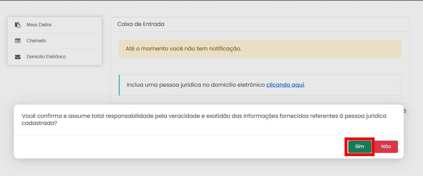 6. Confirme que você assume total responsabilidade pela veracidade e extadião das informações fornecidas referentes à pessoa jurídica cadastrada clicando em SIM
